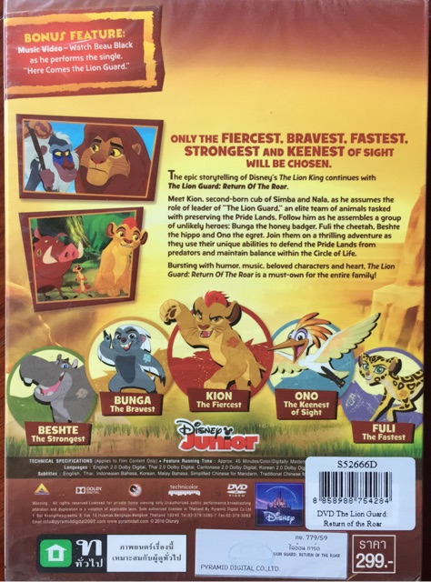 Meet Kion ลูกที่สองเกิดจากสิงโตและหนาเล่อะในขณะที่เขาสมมติบท บาทของการเป็นผู้นำของ The Lion Guard, ทีมงานที่ยอดของสัตว์มอบหมายกับการรักษาแผ่นดินภาคภู มิใจ ปฏิบัติตามเขาในขณะที่เขามั่งกลุ่มของวีรบุรุษไม่น่า : Bunga แบดเจอร์น้ำผึ้ง Fuli เสือชีตาห์, Beshte ฮิปโปและ Ono นกกระยาง เข้าร่วมกับพวกเขาในการผจญภัยที่น่าตื่นเต้นที่พวกเข าใช้ความสามารถพิเศษของพวกเขาที่จะปกป้องแผ่นดินภาคภ ูมิใจจากการล่าและรักษาสมดุลภายในวงกลมแห่งชีวิต เปี่ยมไปด้วยอารมณ์ขัน, เพลง, ตัวละครอันเป็นที่รักและหัวใจ THE LION GUARD: RETURN OF THE ROAR เป็นที่ต้องของตัวเองสำหรับทั้งครอบครัว!