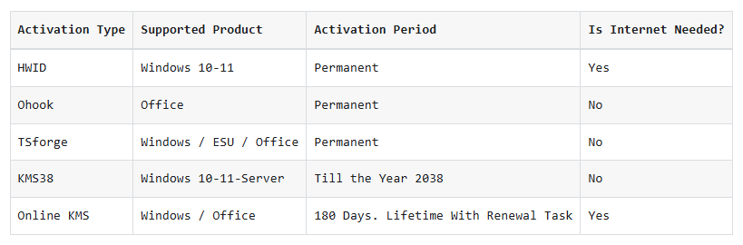 ตัวเปิดใช้งาน Windows และ Office ที่ใช้วิธีการเปิดใช้งาน HWID/Ohook/KMS38/OnlineKMS/TSforge โดยเน้นที่โอเพ่นซอร์สและการตรวจจับไวรัสน้อยลง