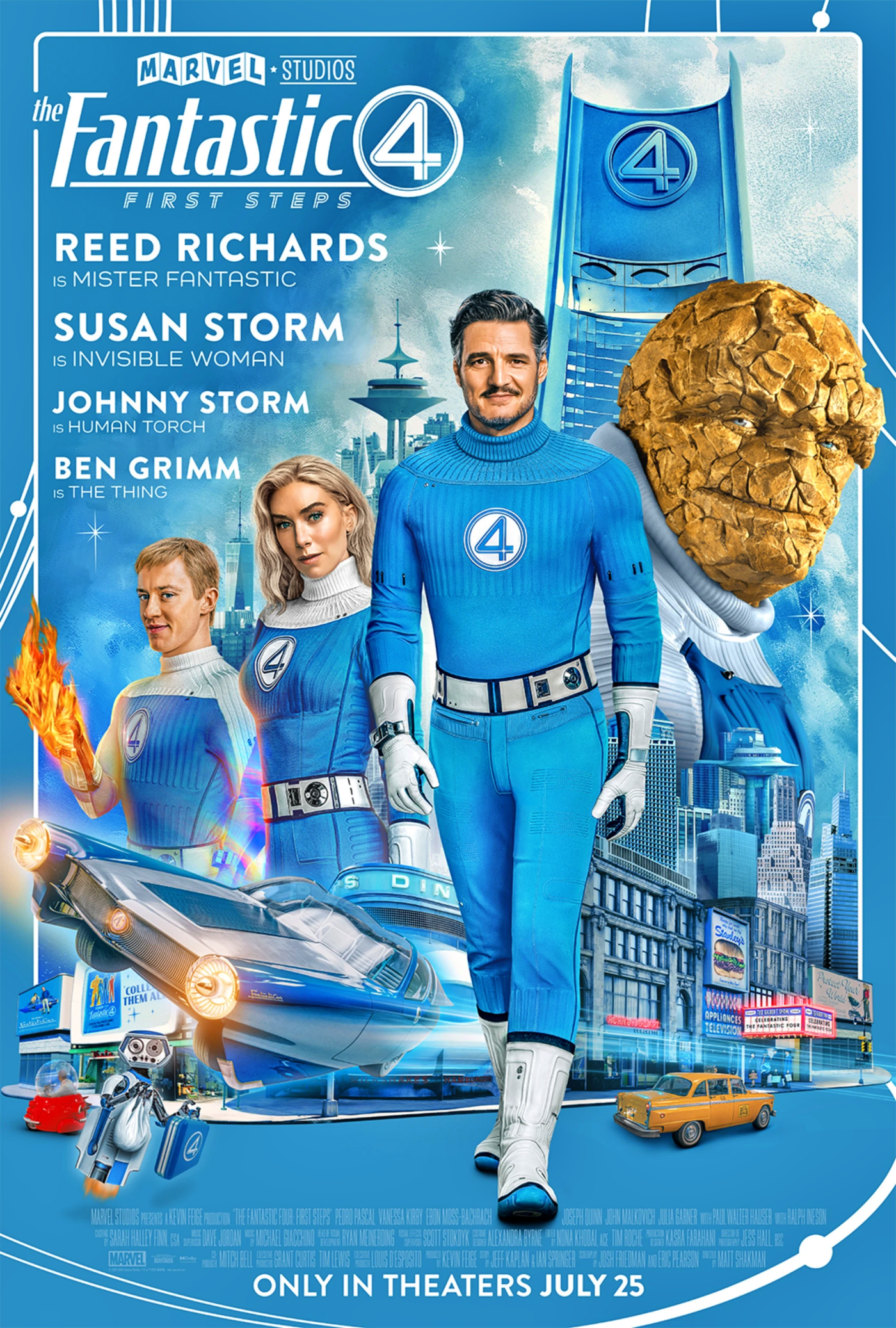 Marvel Studios' The Fantastic Four: First Steps เดอะ แฟนแทสติก 4: จุดเริ่มต้นปฐมบทใหม่ ได้รับการสร้างโดยได้แรงบันดาลใจมาจากโลกแบบ Retro-Futuristic อันฉูดฉาด ในช่วงยุค 1960 โดยภาพยนตร์เรื่องนี้จะเล่าเรื่องราวของครอบครัวแรกข องมาร์เวล—รีด ริชาร์ดส์/Mister Fantastic ซู สตอร์ม/Invisible Woman จอห์นนี่ สตอร์ม/Human Torch และ เบน กริมม์/The Thing เมื่อพวกเขาต้องเผชิญหน้ากับความท้าทายที่น่าหวั่นเก รง และเหมือนถูกบังคับให้ต้องทำทั้งสองหน้าที่ให้ดี ทั้งการเป็นฮีโร่ และ การเป็นสมาชิกในครอบครัว พวกเขาจะต้องปกป้องโลกจากเจ้าแห่งความละโมบจากนอกโลก Galactus และ Silver Surfer และถ้าทุกคนทำหน้าที่ของตัวเองได้ไม่แย่เกินไปนัก แผนการของ Galactus ที่จะยึดครองโลก อาจกลายแผนการที่มีอะไรแอบแฝงมากกว่านั้น